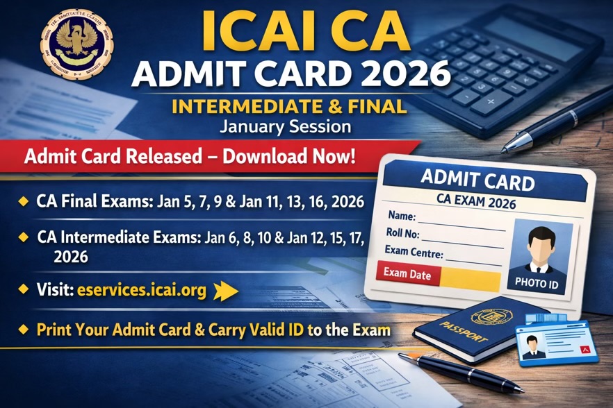 Institute of Chartered Accountants of India (ICAI) ने जनवरी 2026 सत्र के लिए CA Intermediate और CA Final परीक्षाओं के एडमिट कार्ड जारी कर दिए हैं। जिन उम्मीदवारों ने इस सत्र के लिए पंजीकरण किया है, वे अब आधिकारिक वेबसाइट eservices.icai.org से अपना हॉल टिकट डाउनलोड कर सकते हैं। परीक्षा केंद्र में प्रवेश के लिए एडमिट कार्ड की प्रिंटेड कॉपी अनिवार्य है।