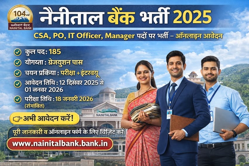 नैनीताल बैंक लिमिटेड ने Customer Service Associate (CSA), Probationary Officer (PO), Specialist Officer और Manager पदों पर भर्ती के लिए आधिकारिक नोटिफिकेशन जारी कर दिया है। इच्छुक और योग्य उम्मीदवार 12 दिसंबर 2025 से 01 जनवरी 2026 तक ऑनलाइन आवेदन कर सकते हैं। यह भर्ती उत्तराखंड, यूपी, दिल्ली, हरियाणा और राजस्थान में स्थित शाखाओं के लिए की जाएगी।